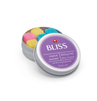 This high dose edible is a great option to share among friends, or to ingest in several different sessions. Advanced users may attempt the entire tin. Bliss Gummies Tropical Assorted 200 mg THC are an excellent edible experience.